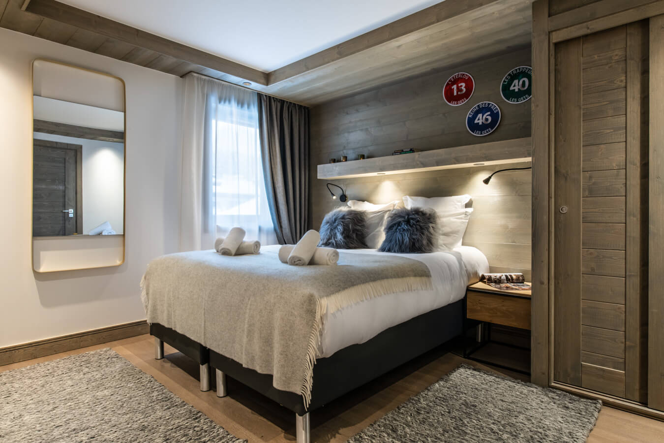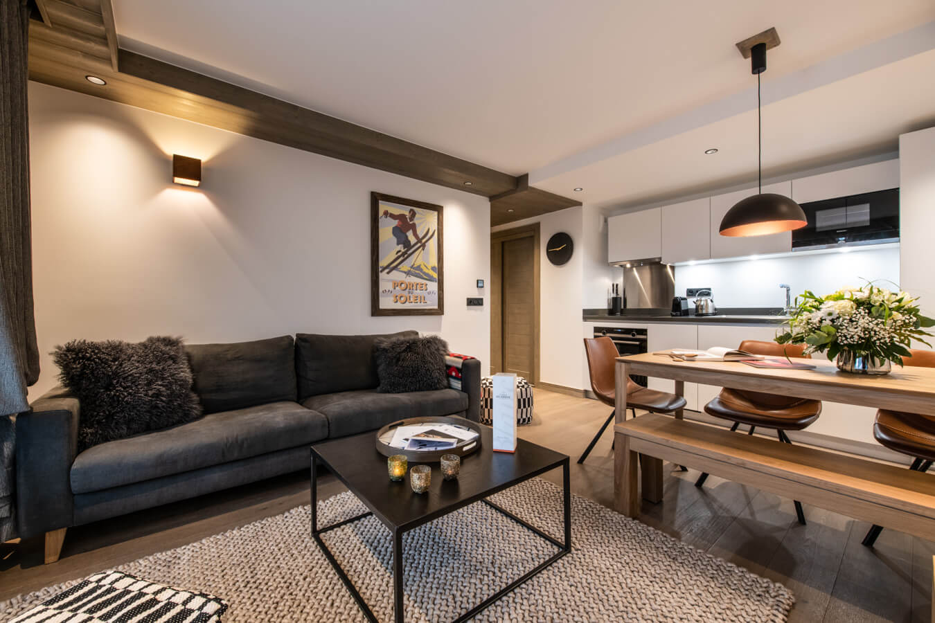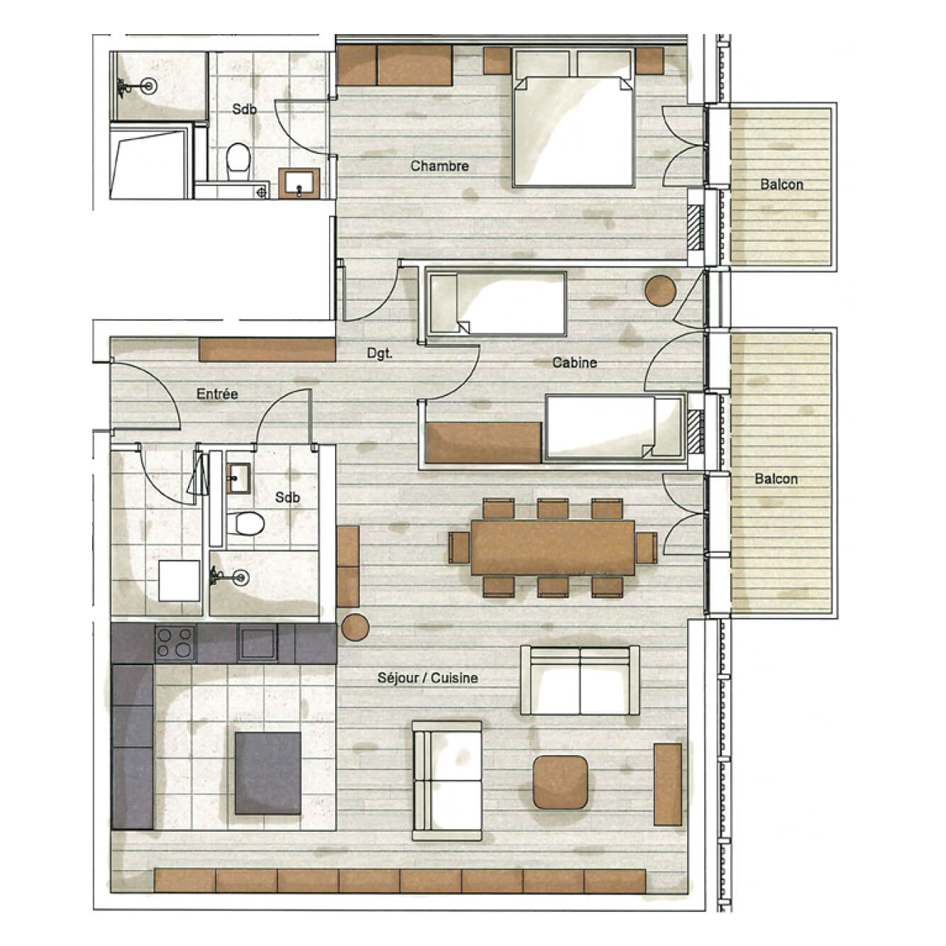 Diese Wohnung verfügt über ein Schlafzimmer mit Doppelbett (180 × 200 cm), ein Schlafzimmer mit zwei Etagenbetten sowie über zwei Badezimmer en suite. Der Wohnbereich bietet eine Sitzecke mit Fernseher und eine voll ausgestattete offene Küche. Ein möblierter Balkon ergänzt den Wohnraum. Zur Ausstattung der Wohnung gehören Haushaltsgeräte wie Waschmaschine und Trockner, Geschirrspüler, Nespresso-Kaffeemaschine, notwendige Küchenutensilien usw.