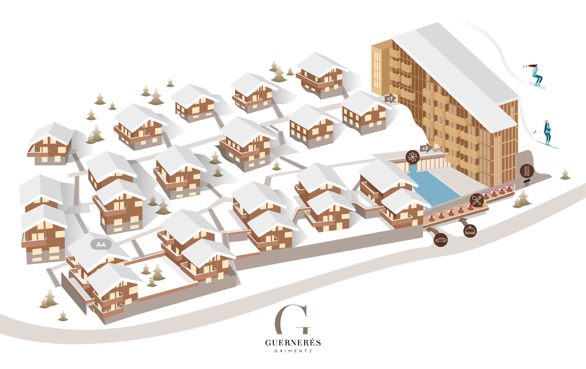 Die Chalet-Wohnung A4, ein Duplex, gelegen auf der zweiten und obersten Etage des Chalets A, an der linken Südseite in der unteren Reihe des Chalet-Bereichs des Resorts Guernerés, bietet eine Fläche von 100 m² und Platz für bis zu 6 Personen.