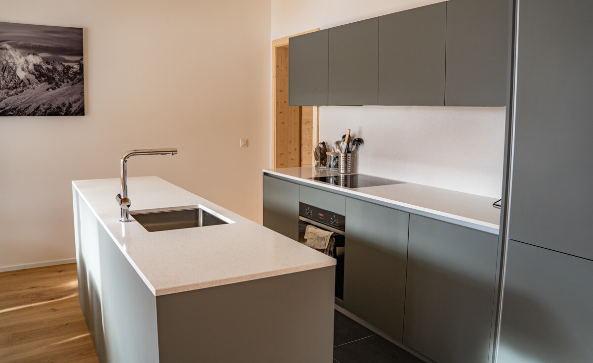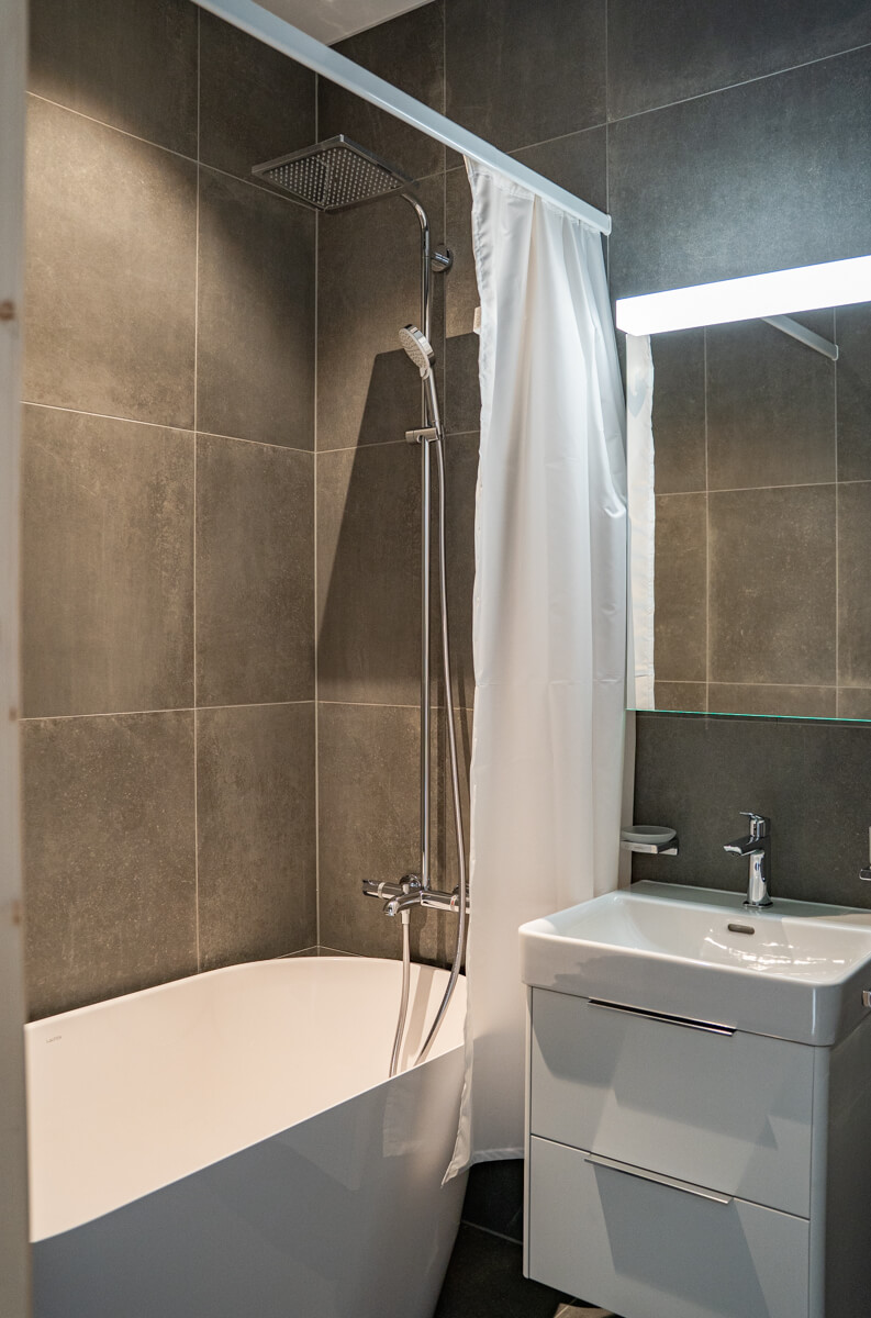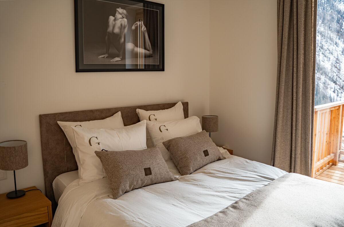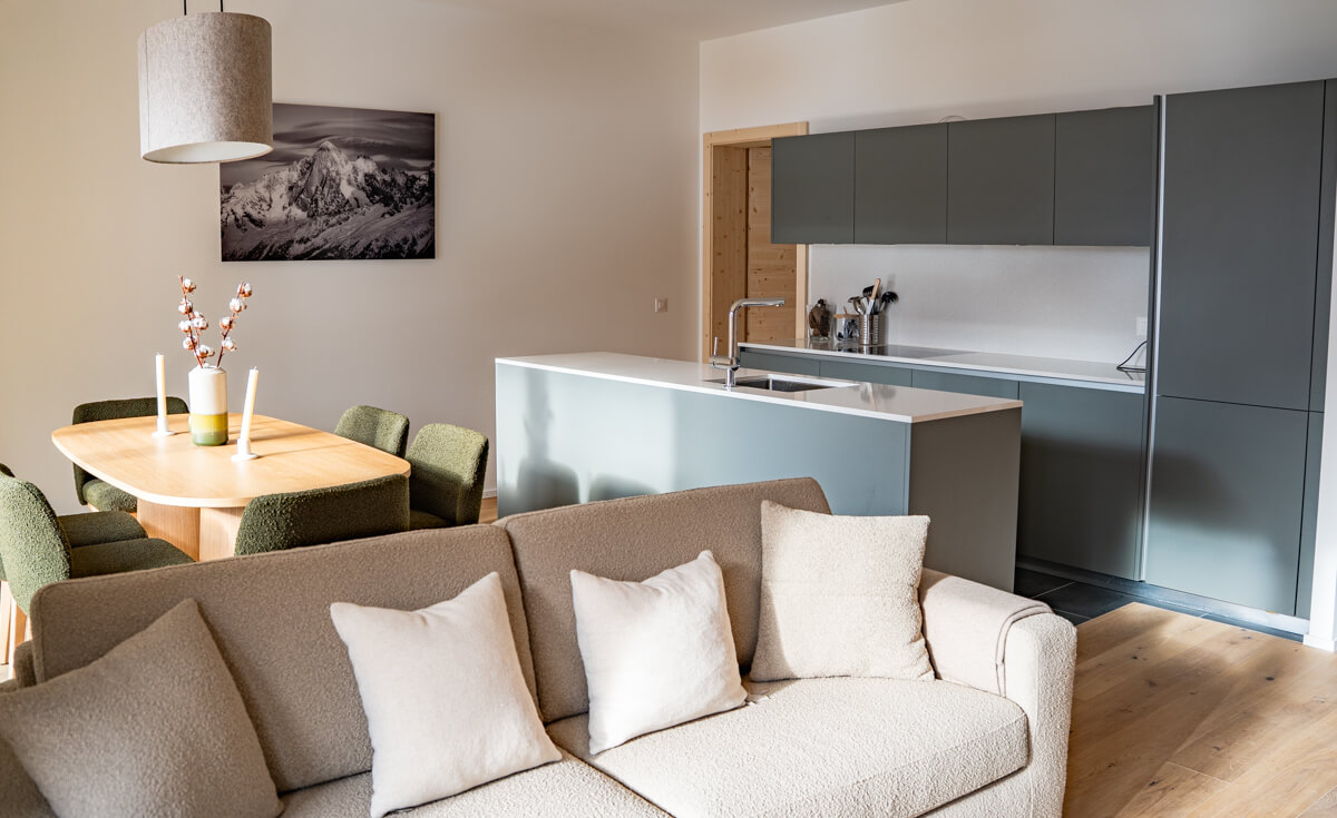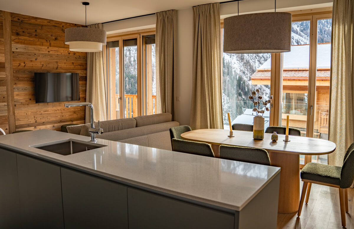 Diese Wohnung verfügt über zwei Schlafzimmer mit Doppelbetten (180 × 200 cm, 160 × 200 cm), ein fensterloses Schlafzimmer mit Doppelbett (160 × 200 cm) sowie über zwei Badezimmer, eines davon mit Badewanne. Der Wohnbereich bietet eine Sitzecke mit Fernseher und eine voll ausgestattete offene Küche. Möblierte Balkone ergänzen den Wohnraum. Zur Ausstattung der Wohnung gehören Haushaltsgeräte wie Waschmaschine, Geschirrspüler, Nespresso-Kaffeemaschine, notwendige Küchenutensilien usw.