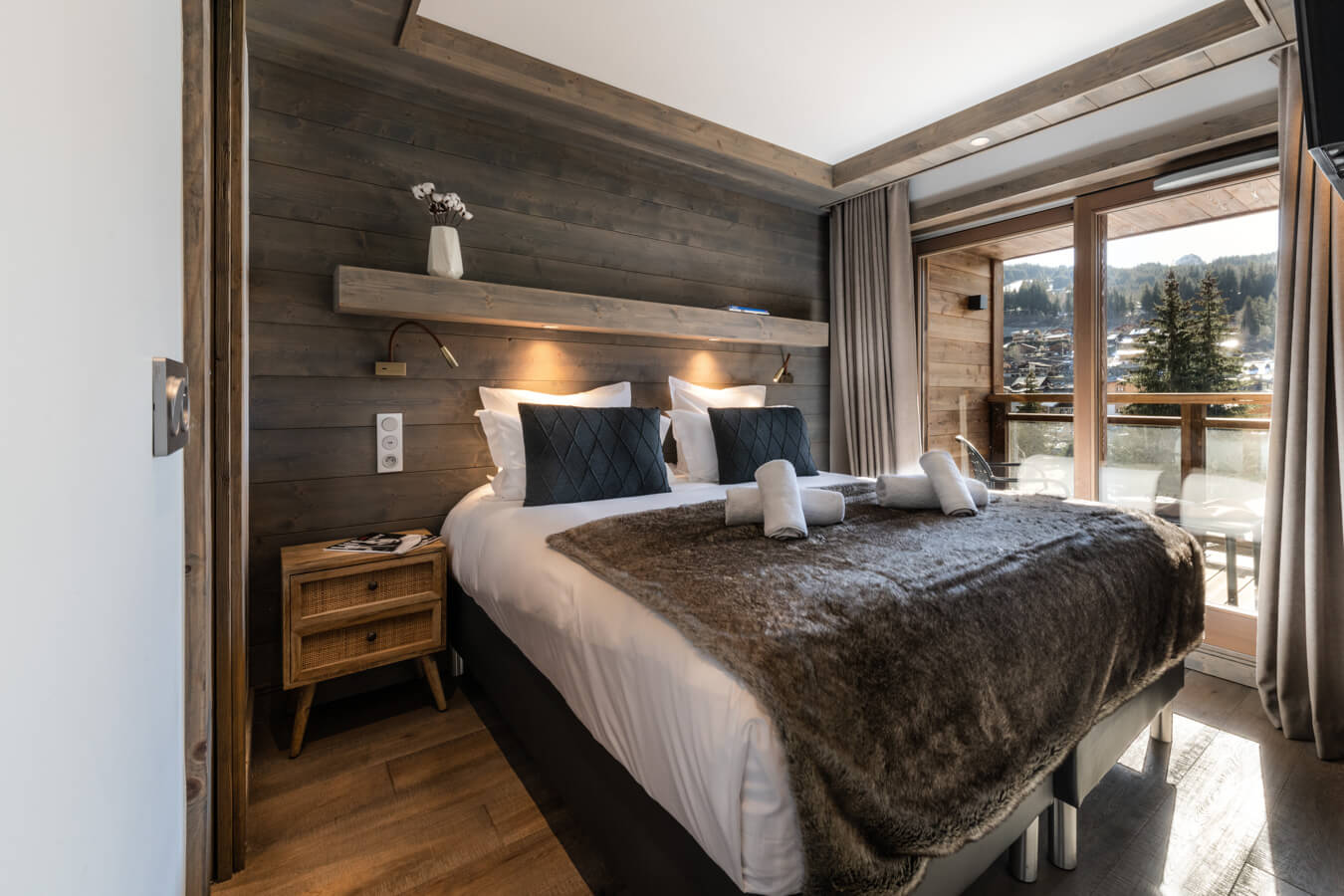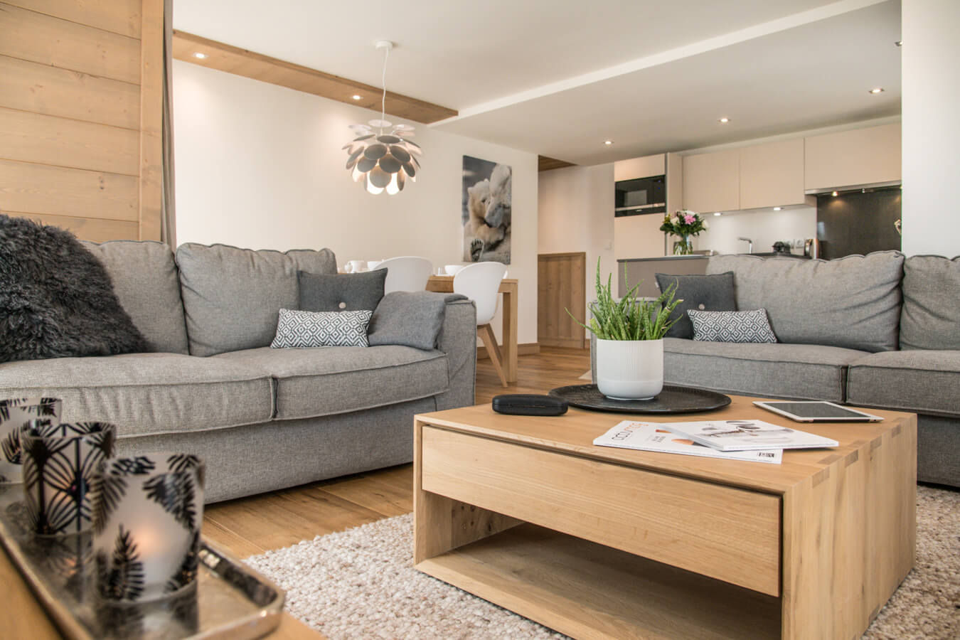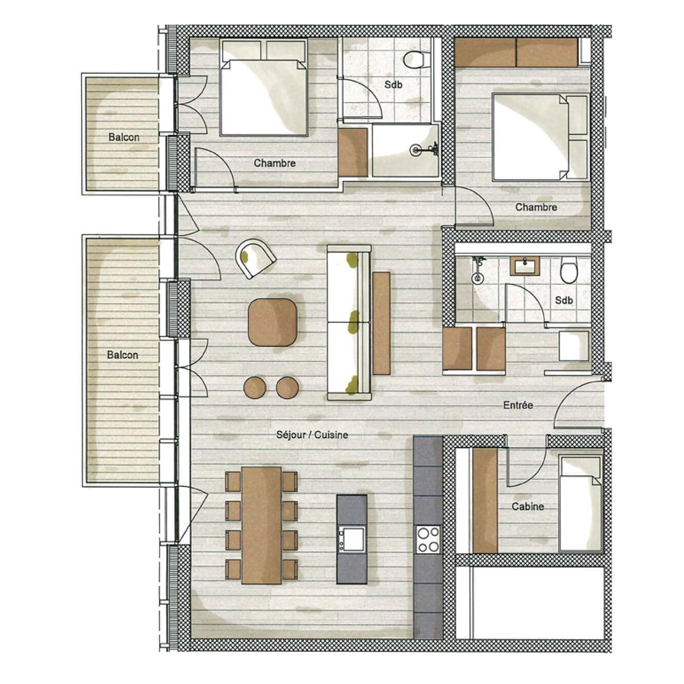 Diese Wohnung verfügt über ein Schlafzimmer mit Doppelbett (180 × 200 cm), ein fensterloses Schlafzimmer mit zwei Einzelbetten (90 × 200 cm), ein Kabinenschlafzimmer mit Etagenbett sowie über zwei Badezimmer. Der Wohnbereich bietet eine Sitzecke mit Fernseher und eine voll ausgestattete offene Küche. Möblierte Balkone ergänzen den Wohnraum. Zur Ausstattung der Wohnung gehören Haushaltsgeräte wie Waschmaschine, Geschirrspüler, Nespresso-Kaffeemaschine, notwendige Küchenutensilien usw.