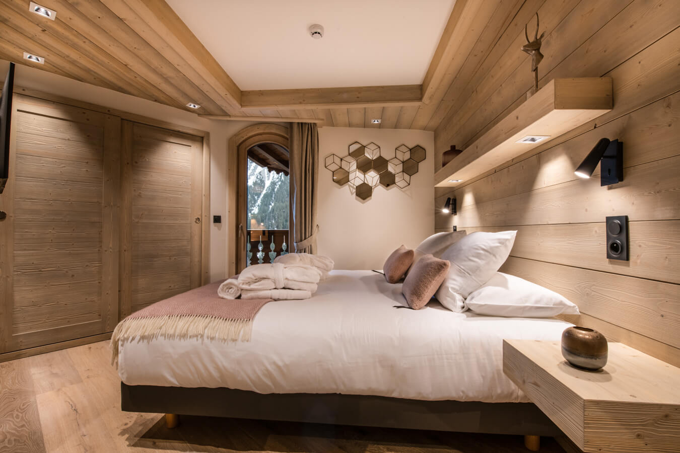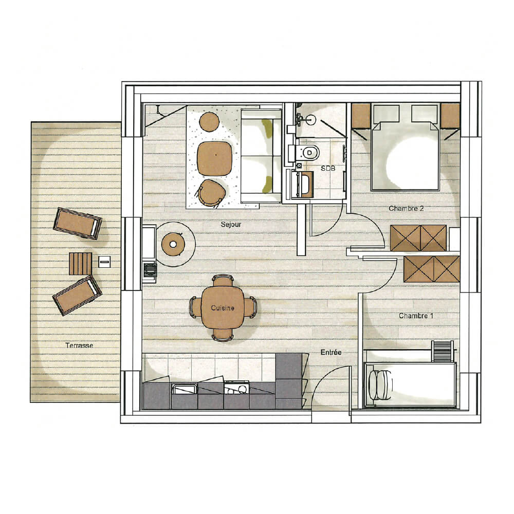 Diese Chalet-Wohnung verfügt über ein Schlafzimmer mit Doppelbett (160 × 200 cm), ein Schlafzimmer mit Etagenbett für 3 Kinder sowie über ein Badezimmer mit Dusche. Der Wohnbereich bietet eine Sitzecke mit Fernseher, eine voll ausgestattete Küche, einen Holzofen und zwei Terrassen, darunter eine nach Süden ausgerichtete Terrasse. Das Chalet ist nach Süden und Norden ausgerichtet. Zur Ausstattung gehören Haushaltsgeräte wie Geschirrspüler, Nespresso-Kaffeemaschine, notwendige Küchenutensilien usw.